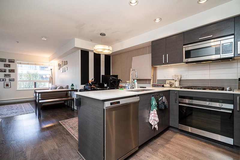 Walk to fantastic dining and shopping from this unbeatable location. This one-bedroom + den features two full bathrooms, one parking stall, and a storage locker. The stunning kitchen boasts quartz countertops, sleek cabinetry, and premium Fisher & Paykel/Blomberg appliances—including a gas range. The open-concept dining and living areas shine with wide-plank flooring and open onto a 46sf covered patio—ideal for morning coffee or summer BBQs (gas hookup included). Both bathrooms offer soaker tubs, quartz counters, undermount sinks, and upscale finishes. The generous den works perfectly as a home office or extra storage. Just 10 minutes to UBC and the Westside's top private and public schools! OPEN HOUSE SUNDAY APRIL 26 2PM-4PM.