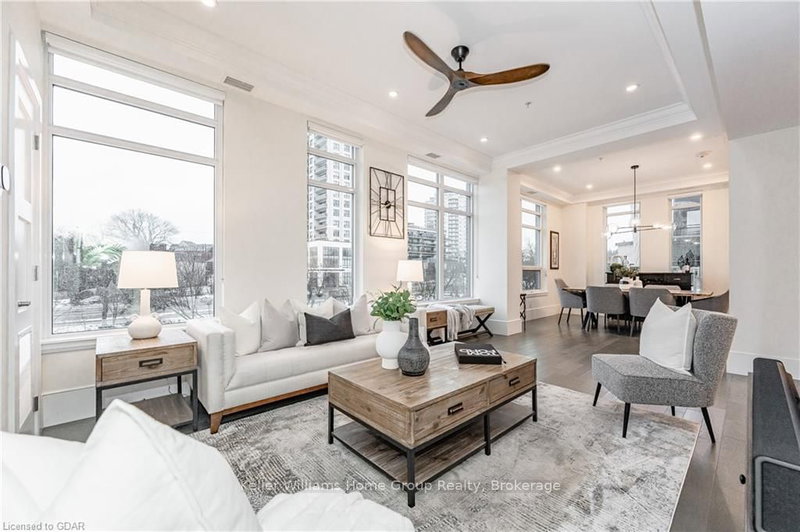 Welcome to the stunning BHB-63 Arthur St S! This luxurious executive waterfront Bankhouse is the epitome of opulence and elegance. Located in the heart of downtown Guelph, this 2-bed, 2.5-bath plus den is ready to awe you with its stunning features. As you step inside, you'll be greeted by soaring ceilings and modern finishes throughout that include stainless steel high-end appliances, gleaming quartz countertops and backsplash, upgraded taps and lighting, along with a custom built-in bar with wine fridge, display shelving, and cabinets in the den area. From your balcony and patio, you'll have a breathtaking view of the Speed River, and exclusive use of the 600 sqft patio, finished with premium porcelain tiles and your own private gas BBQ. You will also fall in love with the fact that it provides direct access to the boardwalk and the Springmill Distillery, making it even easier to take in the beauty of the area. All bedrooms have their own ensuite with walk in closets and in case you need additional storage this unit includes a locker and has 2 privately owned underground parking spaces. The MetalWorks development also boasts incredible amenities throughout that as an owner you will have full access to, including a public electric vehicle charging station, a speakeasy lounge, a media room, a library, a community kitchen, guest suites and more. Now let's also talk location... it is simply unbeatable! With the downtown core just a stone's throw away, you'll be able to walk to a variety of boutique shops, mouthwatering restaurants, parks, trails, have easy train access, entertainment at the River Run Centre, and Sleeman Centre. This unit is a rare gem in the city, offering a once-in-a-lifetime opportunity to own a piece of luxury in the heart of Guelph. Don't miss out!
