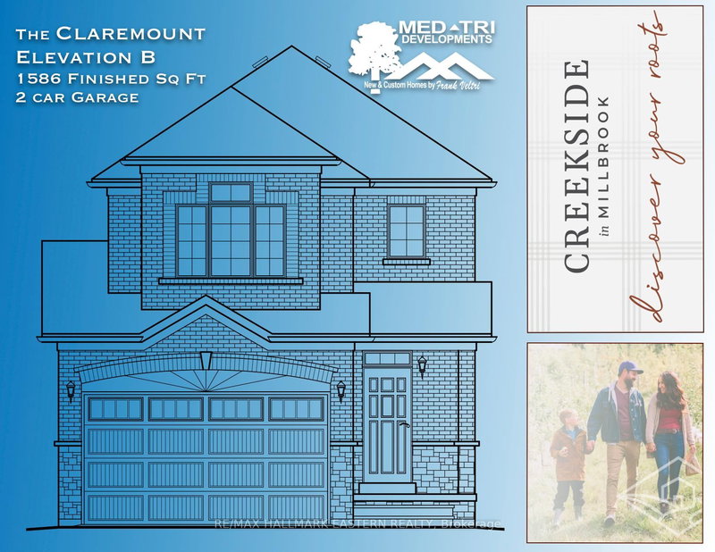 Select your own interior Finishes! Creekside in Millbrook's most popular model "The Claremount", upgraded elevation B with stone clad front porch and 2 car attached garage is under construction now fall occupancy. Unique to this model is a second storey Family Room featuring a cathedral ceiling and gas fireplace. The design, by Millbrook's "hands on" quality Builder, Frank Veltri, includes 3 bedrooms, 3 baths, main floor Den, and bright, open concept living, dining and kitchen with quartz counters, potlighting and pantry cabinetry. This is 1951 square feet of finished living space plus unfinished basement with rough-in for 4th bath. The main floor features include engineered hardwood flooring, 9 foot troweled ceilings and glass sliding door walkout to the back yard. Come to the Open Houses in Creekside in Millbrook held Wednesday and Thursday evenings, 5-8:00 pm for tours of finished models and more information. This property is located within the historic limits of the Village, in a small (31 Units) family oriented neighbourhood which, when finished, will include a walkway through parkland to Centennial Lane close to Millbrook's elementary school, Millbrook Valley Trails system and the ecclectic Downtown which offers everything you want and need: Daycare, Hardware, Groceries, Restaurants, Auto Services, Computer & other Professional Services, Ontario Service Office, Wellness & Personal Care, Wine & Cheese, Chocolate, Consignment Furniture & Home Decor, Festivals and the Feeling that this is the place where you belong.