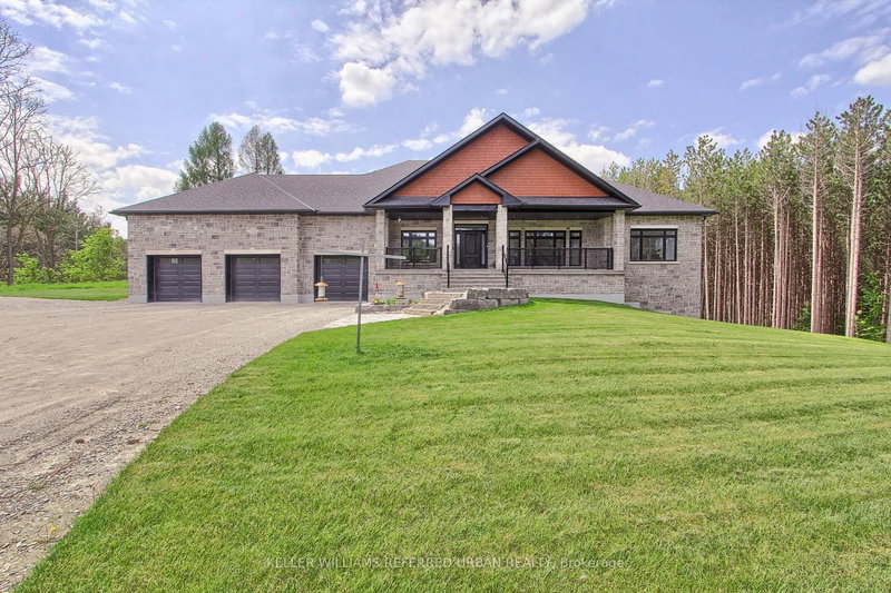Nestled on a tranquil 3.25-acre estate and surrounded by mature trees, this custom-built residence is where nature and luxury live in perfect harmony. A private, tree-lined driveway welcomes you to over 5,000 square feet of thoughtfully crafted living space, offering a rare blend of elegance, energy efficiency, and serene country living, all just minutes from city convenience. From the beautifully landscaped front yard to the expansive covered porch, every detail invites you in. Inside, an open-concept layout with soaring 10-ft ceilings and oversized windows fills the space with natural light. The living area, framed by vaulted ceilings, centres around a beautiful fireplace that adds warmth and charm on chilly evenings. The chefs kitchen is an entertainers dream, complete with a large centre island, premium appliances, and direct access to a sprawling rear deck, ideal for barbecues and gatherings. The adjacent dining room offers seamless hosting potential. Designed for privacy, the split-bedroom layout features a stunning primary suite with a walk-in closet, spa-like ensuite, and private deck access. Two additional bedrooms overlook the treed yard and share a Jack & Jill bathroom. A bright main-floor office, centrally located powder room, and well-appointed laundry room with garage access complete the main level. The lower level offers excellent in-law suite potential, combining style and comfort. A second kitchen with island and walk-out to the yard complements the spacious living area with large windows and a fireplace. Two generous bedrooms share a Jack & Jill bath, while an additional full bath, large storage space, and garage access adds additional function and flexibility. Outside, expansive lawns and a charming barn invite endless possibilities, whether for a workshop, studio, or future conversion. Located minutes from Hwy 400, Tanger Outlets, and a short drive to Barrie or Bradford, this is luxury countryside living in perfect harmony with nature.